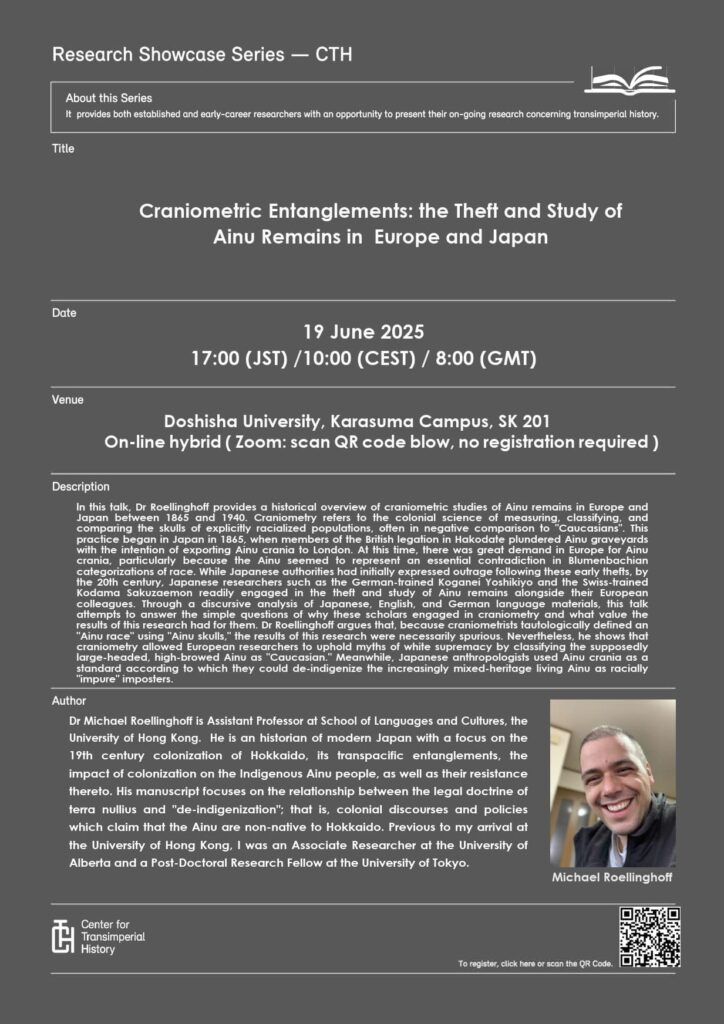 Michael Roellinghoff, ‘Craniometric Entanglements: the Theft and Study of Ainu Remains in Europe and Japan’, 第5回 Research Showcase Series, (Center for Transimperial History, 2025年6月19日、ハイブリッド開催)