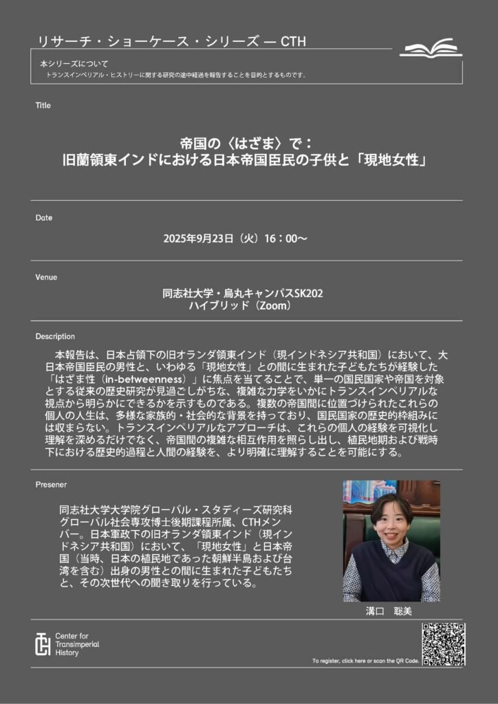 溝口聡美「帝国の〈はざま〉で:旧蘭領東インドにおける日本帝国臣民の子供と「現地女性」」、リサーチ・ショーケース(Center for Transimperial History, 2025年9月23日、ハイブリッド開催)